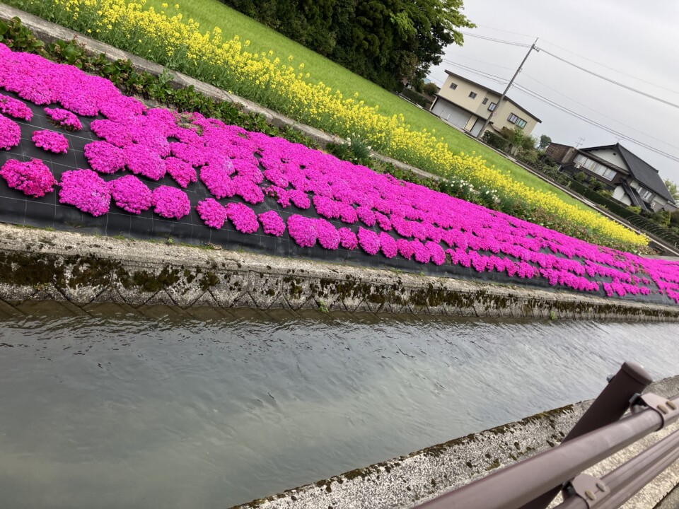 また、芝桜のそばに小川や用水も流れていて、水の流れる音にも癒されます。