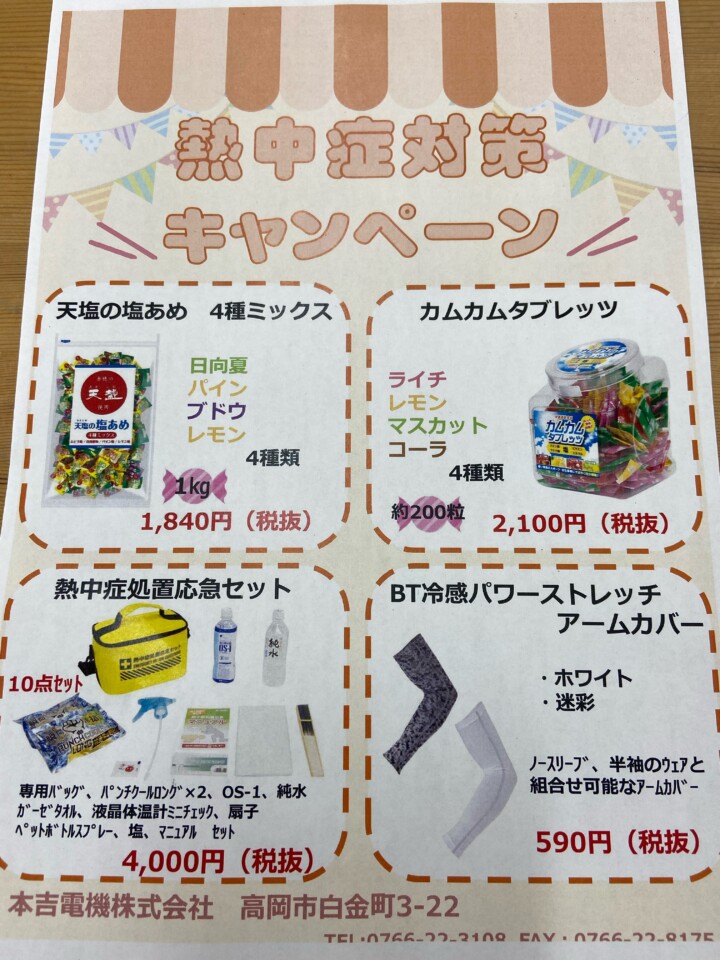 2021-07-21 新商品 暑い夏を乗り切る為に 暑い日が続くこの頃、いかがお過ごしでしょうか? 最近は特に熱く、熱中症により搬送されたと言うニュースをよく見かけます。 今月はそんな熱中症対策として塩飴や応急セット等のキャンペーンをやっております(^-^) しっかりと対策をして、今年も暑い夏を乗り切りましょう!! 関原